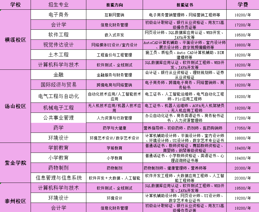 紫金学院:四人间,上床下桌,独立卫浴,空调,住宿费2500元/一年
